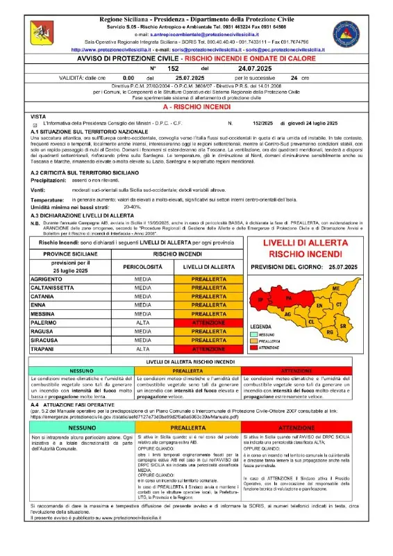 Comunicato protezione civile regionale.Avviso di protezione civile per rischio incendi e ondate di calore.Domani‚ giovedì 26 luglio 2025‚ è prevista una pericolosità MEDIA per rischio incendi in tutta la Sicilia. Bollino rosso per rischio Ondate di Calore a Messina e Catania.