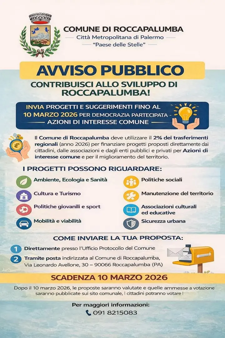 📢 AVVISO PUBBLICO – DEMOCRAZIA PARTECIPATA 2026 Il Comune di Roccapalumba invita cittadini, associazioni ed enti a pres...